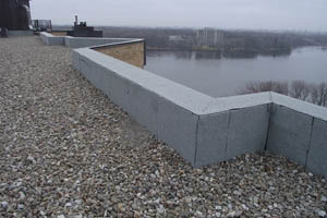 - Description du projet : En incluant la toiture des deux appentis, la superficie totale est de 17171 pi². Les toitures sont de type renversé composé de deux membranes Soprema recouvertes d’un isolant thermique de trois pouces en panneaux de polystyrène rigide de type IV, d’une toile filtrante et d’un lest en pierre de rivière propre et de poids suffisant pour résister aux charges du vent. Le projet comprend en plus de la réfection du recouvrement de la toiture principale, i) la réfection du recouvrement de la toiture des deux appentis, ii) le déplacement sur la toiture principale des quatre moteurs de ventilation installés sur les murs de l’appentis sud, le remplacement du recouvrement des murs des deux appentis et la reconstruction de la terrasse de l’unité 1209.